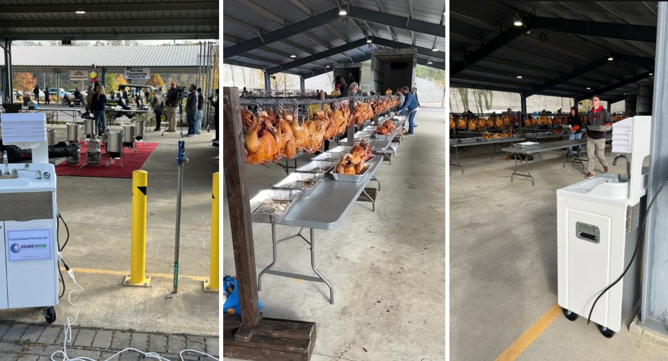 With that many people handling food, hand hygiene was critical. That’s where Ozark River came in. We provided and maintained eight portable handwashing sinks across the cooking and prep areas, ensuring volunteers could wash up quickly and conveniently without interrupting the flow of the operation.